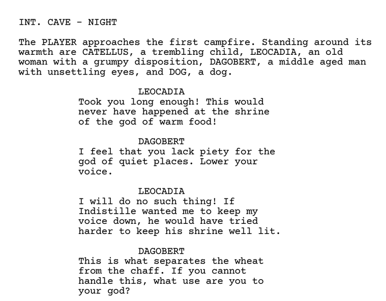 This is a screenshot from the first cutscene. Once I understood who the player would meet, I wanted to consider how they would interact with one another. I only wish I could have written more for this project.