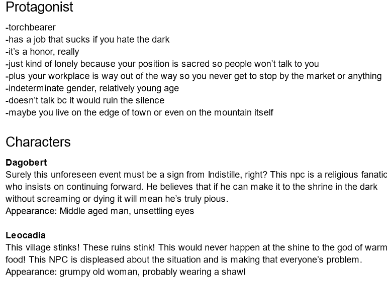 This is a screenshot from my narrative design document for this project. Before I even started designing the puzzles or writing the cutscenes I wanted to nail down what the world would be like and who would inhabit it.