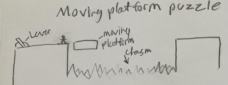 This is an example of one of the puzzles I designed. I wanted the player to have to set their lantern down, run to activate a lever, and then run back and grab their lantern before hopping on the moving platform. Many of the puzzles that I originally designed would end up being changed in some form as our programmers developed the code for the puzzle mechanisms.
