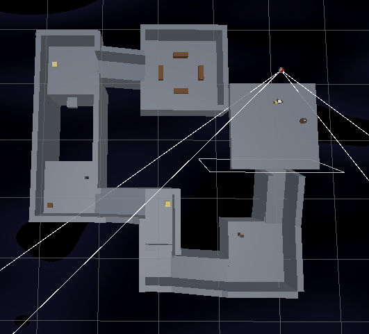 This is a bird’s eye view of the first whitebox I did of the first level. I wasn’t happy with how this turned out, so I taught myself how to use ProBuilder tools to improve the design of it. I would also go on to rearrange the puzzles for a more gradual buildup of the player’s skills.